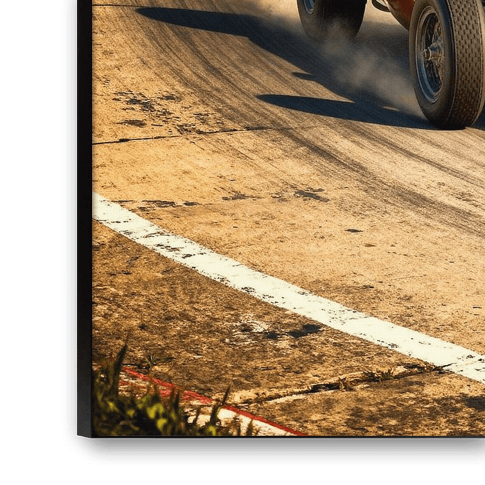 As I stand before this painting, my eyes are instantly captivated not just by the bold red of the Alfa Romeo Alfetta 1950 racing across the legendary Monza circuit, but by the presence of Italian flags waving along the track’s edge—a chorus of green, white, and red weaving through the moment. The car’s vivid color finds its echo in each flag, together forming a rhythm that beats with national pride and the spirit of motorsport.