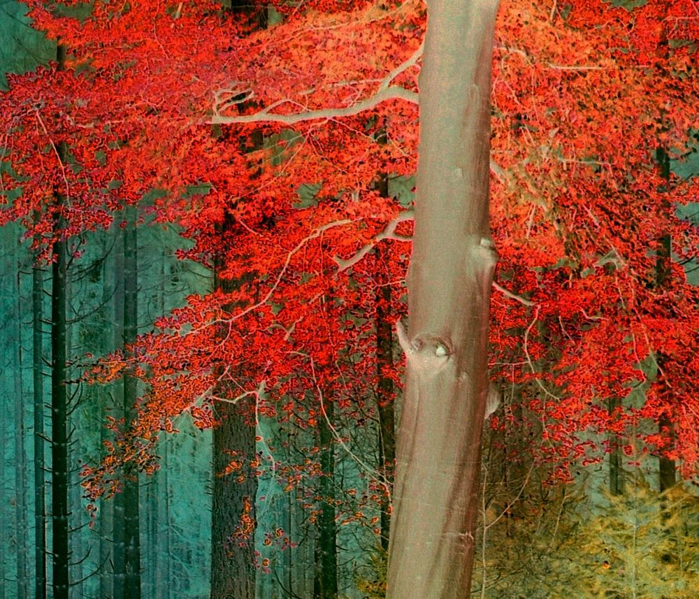 I edited this beautiful beech tree resulting in these popping colors. A tree stands in a forest and stands out with its red leaves. The trunks of the pine trees in the background are blue / turquoise. I especially like the contrast between blue and red.