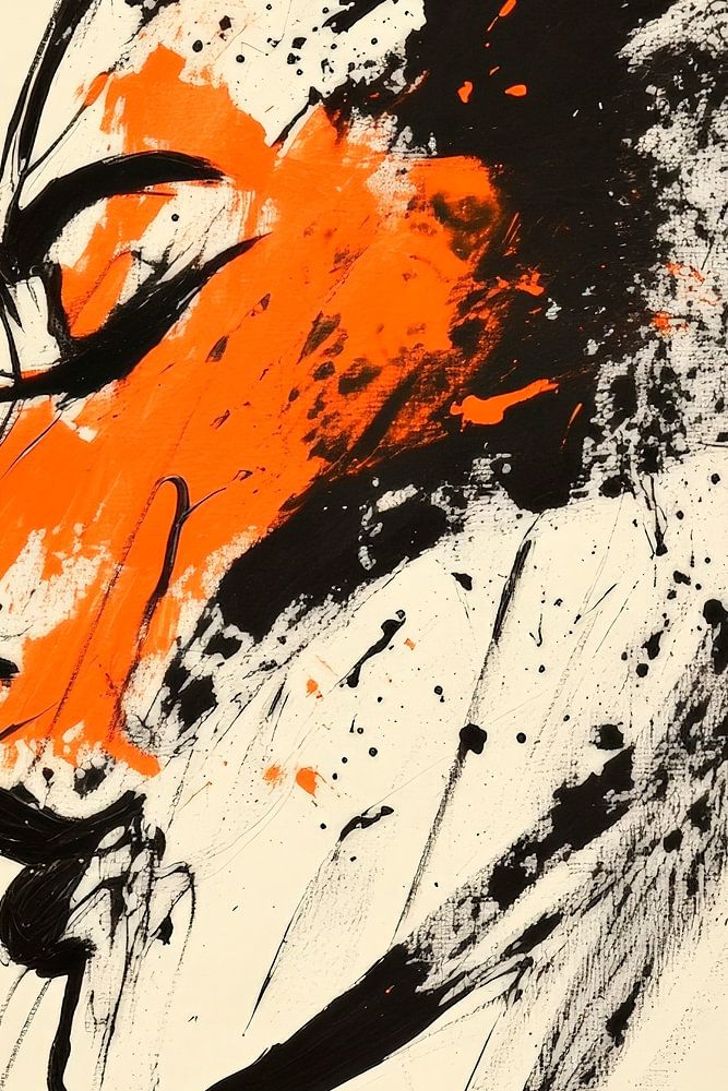 A powerful portrait that captures the emotion and strength of femininity with dynamic brushstrokes and bright orange. The contrasting black and orange tones add a modern touch to the artwork. Perfect for the living room or creative office to encourage inspiration and expression.