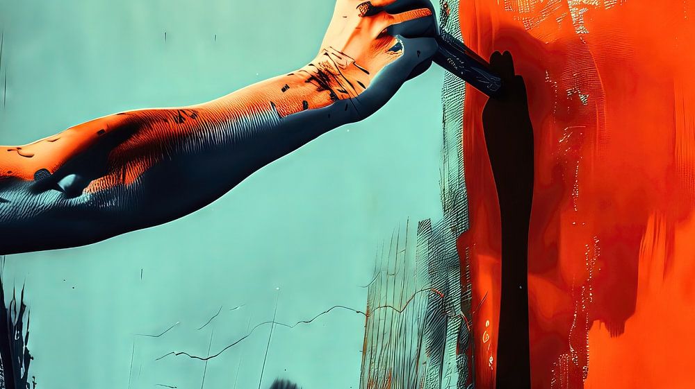 This vibrant image shows a talented artist painting an orange wall with colourful brushstrokes, adding an artistic touch to the urban landscape. The artist's dynamic and energetic movements are clearly visible, adding a vibrant and creative atmosphere to the scene. The bold colours and varied patterns that adorn the wall create a striking contrast to the urban surroundings and immediately attract attention. The creative energy that flows from the artwork revitalises the public space and adds a new dimension of art and culture to the city. This composition captures the essence of creativity and urban aesthetics and appeals to anyone who is passionate about artistic expression in urban spaces.