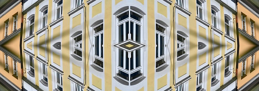 Symmetrical, mirror-like depiction of a building façade. The centre of the picture is the focal point, from which the façade is repeated to the left and right and tapers outwards. The yellow and white parts of the building are mirrored several times, creating a kaleidoscope-like effect. The blue sky and the palm leaves that can be seen in the background also blend into the symmetrical pattern and reinforce the optical illusion. The overall picture has a geometric and surreal effect, as if the buildings were reaching infinitely into the depths.