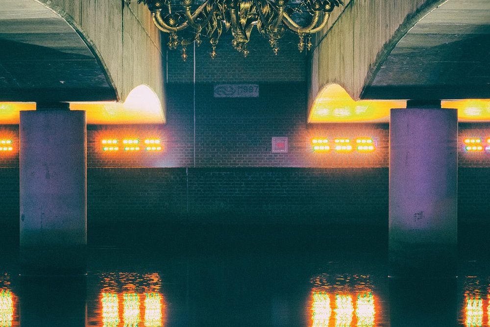 Railroad over river Eems in Amersfoort in the province of Gelderland in the Netherlands. Artwork under concrete viaduct above water with colorful LED lighting and a special chandelier. Public art work with oraj and purple colors and reflection in the water surface