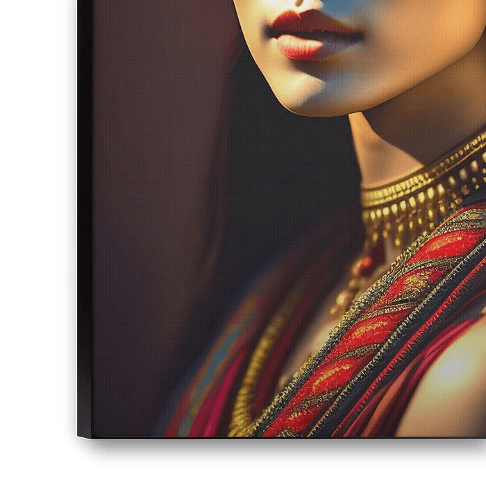 with high cheekbones, full lips, and dark, expressive eyes. She is wearing traditional tribal clothing and jewelry, adding to her exotic and alluring appearance.