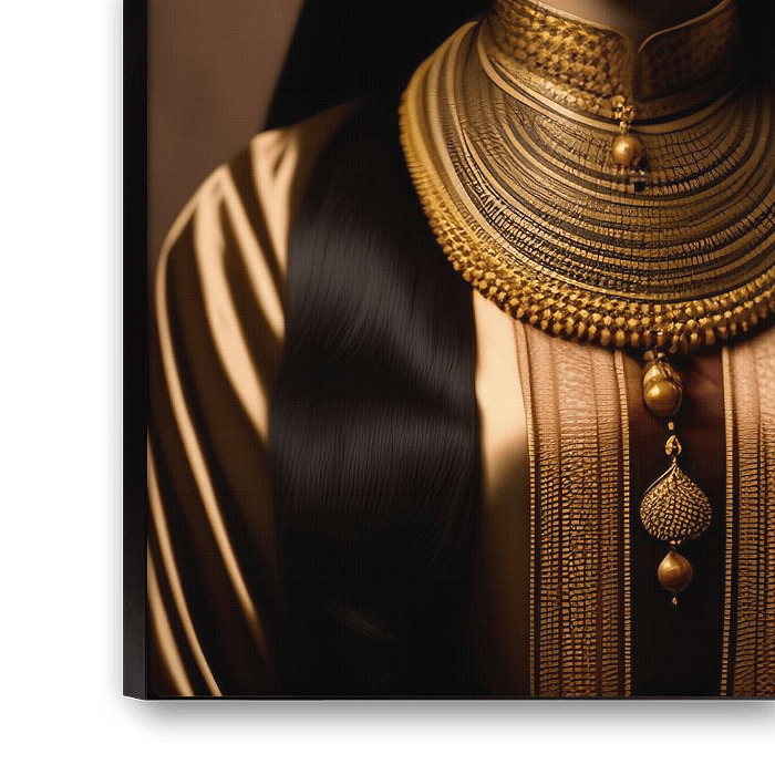 with high cheekbones, full lips, and dark, expressive eyes. She is wearing traditional tribal clothing and jewelry, adding to her exotic and alluring appearance.