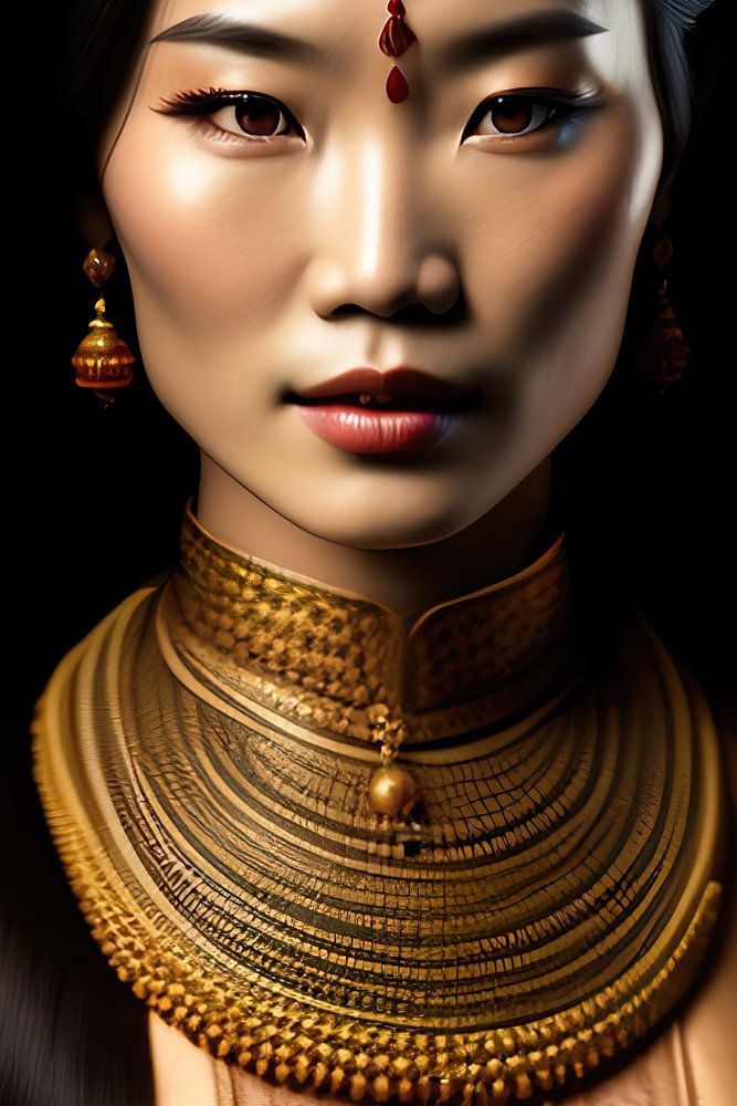 A digital painting of an Asian tribal lady using earth tone colors such as terracotta, rich ochre yellows would likely feature a figure with a strong and expressive face, adorned with traditional tribal clothes.