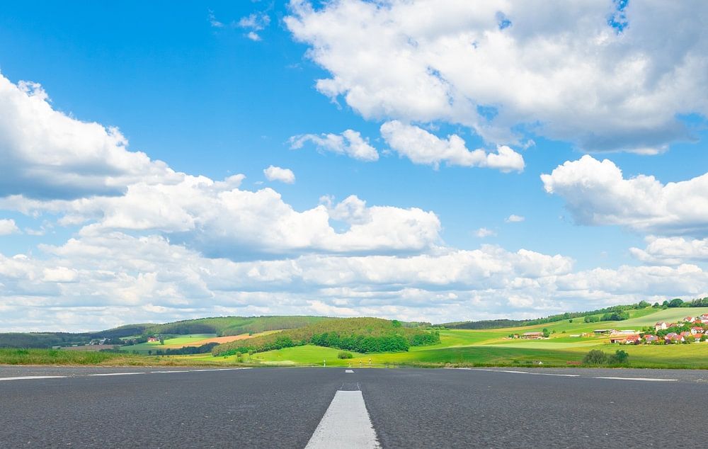 Asphalt road with white dividing lines, beautiful landscape and cloudy blue sunny sky