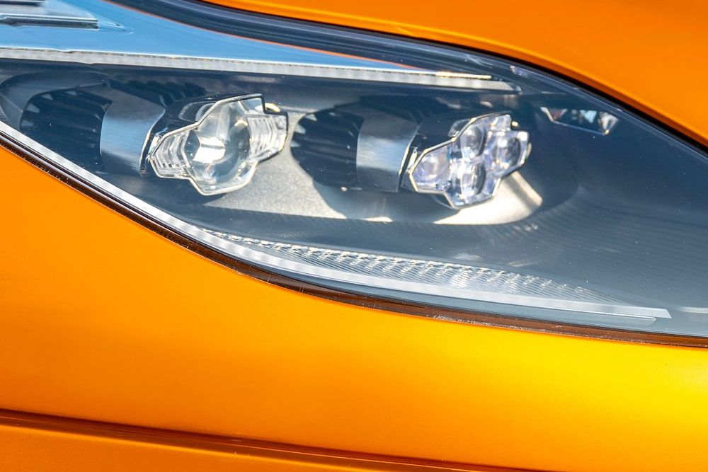 Aston Martin DB11 sports car headlight detail in bright orange. The Aston Martin DB11 is a luxury grand tourer unveiled in 2016 and available with V8 and V12 petrol engines.
