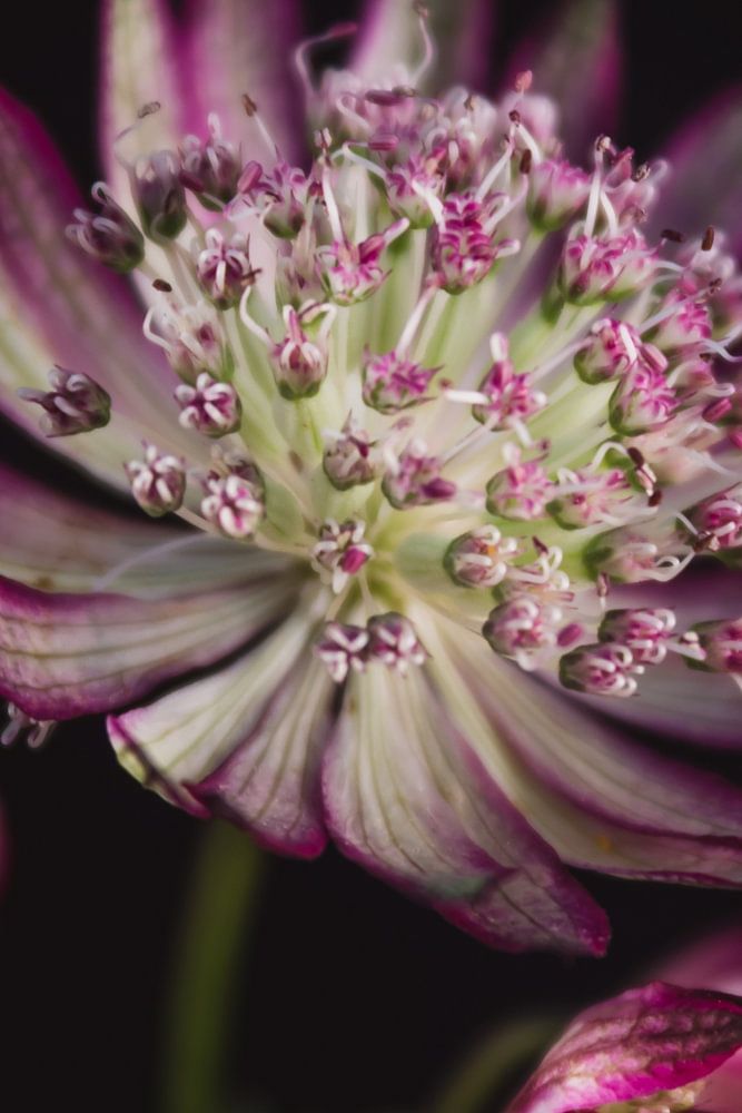 Pink Astrantia Star flower. Sandra Hazes fine art photography. By making creative use of focus, bright colors, light and shadow, a unique magical and dark style is created. Bring nature into your home and enjoy the special atmosphere.