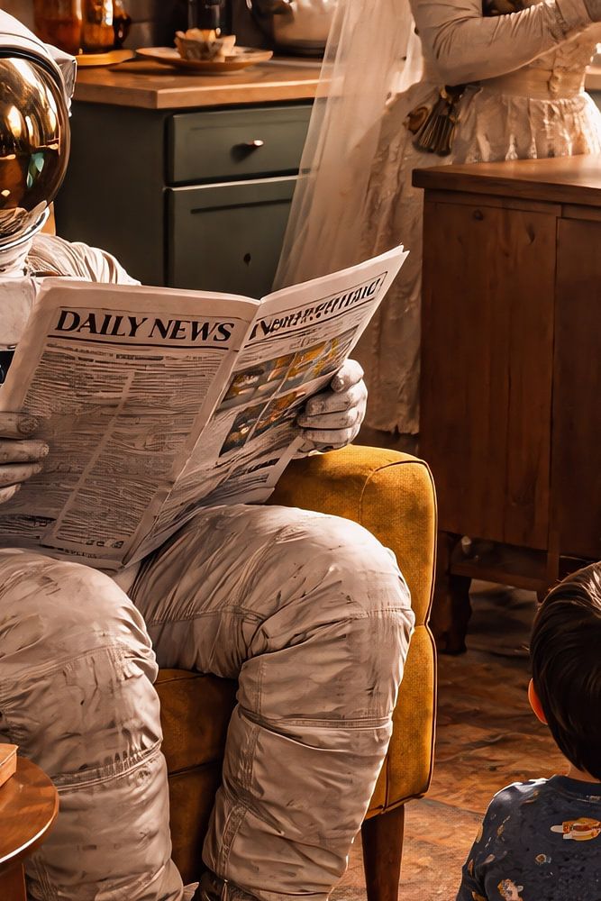 Astronaut Reading While Family Prepares Breakfast by Dodik Hariyono