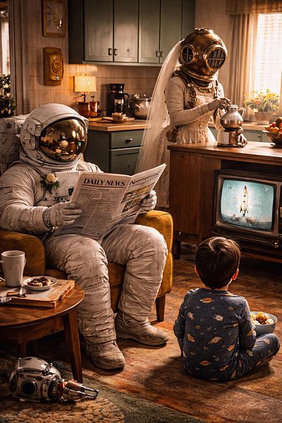 A cozy and imaginative scene of an astronaut relaxing with a newspaper while the family prepares breakfast in a warm kitchen. This playful surreal artwork blends retro home life with space exploration, creating charming sci-fi wall art.