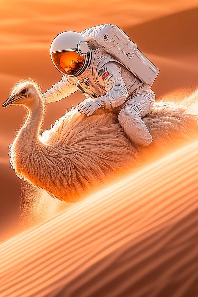 Imagine an astronaut gliding through gentle sand dunes, riding a majestic, feather-light creature. The warm golden evening sun casts a magical light on this surreal scene, awakening a sense of adventure and imagination. Ideal for a creative living room or inspirational office to stimulate conversation and encourage dreaming.