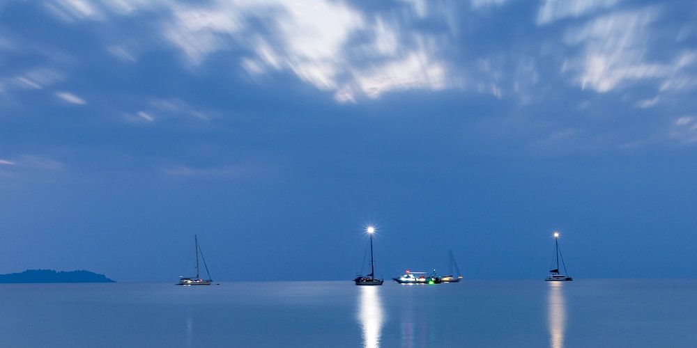 A veil of night lies over the Andaman Sea. The deep blue of the water flows seamlessly into the cloudy sky, as if the sea and sky had merged into a single ocean of darkness. The waves roll softly onto the fine sandy beach of Koh Mook, their crests shimmering dully in the pale glow of the hidden moon. It is as if the world is holding its breath, caught in a moment between dreaming and awakening.