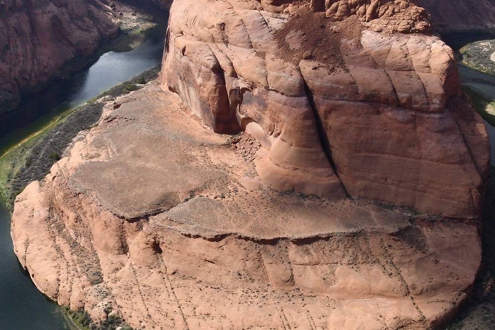A well-known spot where many tourists come to capture themselves with Horseshoe bend in the background. The water of the river gives a nice contrast with its green color. The water is low so you can camp at the foot of the rock. The depth of the canyon overwhelms you. It is cloudy and the colors of the rocks keep changing.