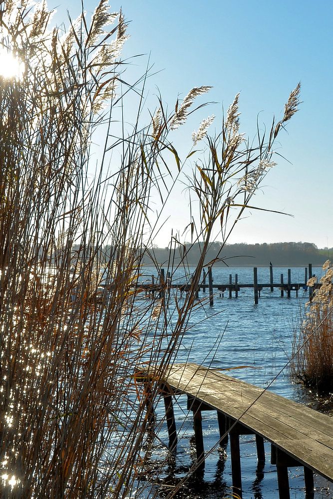 Idyll at the lake - jetty and reed with bright sun and blue sky, on the island Rügen near Sellin, Germany