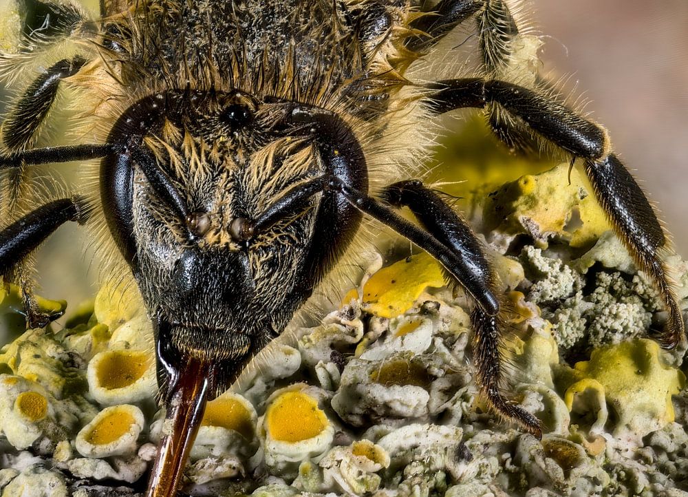 Macro photography using focus stacking you imagine yourself in another world that is almost surreal. It is not just a snapshot but an image that can take hundreds of photographs and many hours of work. By merging many photos with a different focus, you get a larger depth of field. A true and unique work of art. In this picture a bee at rest. She has worked up a sweat and finished her job.