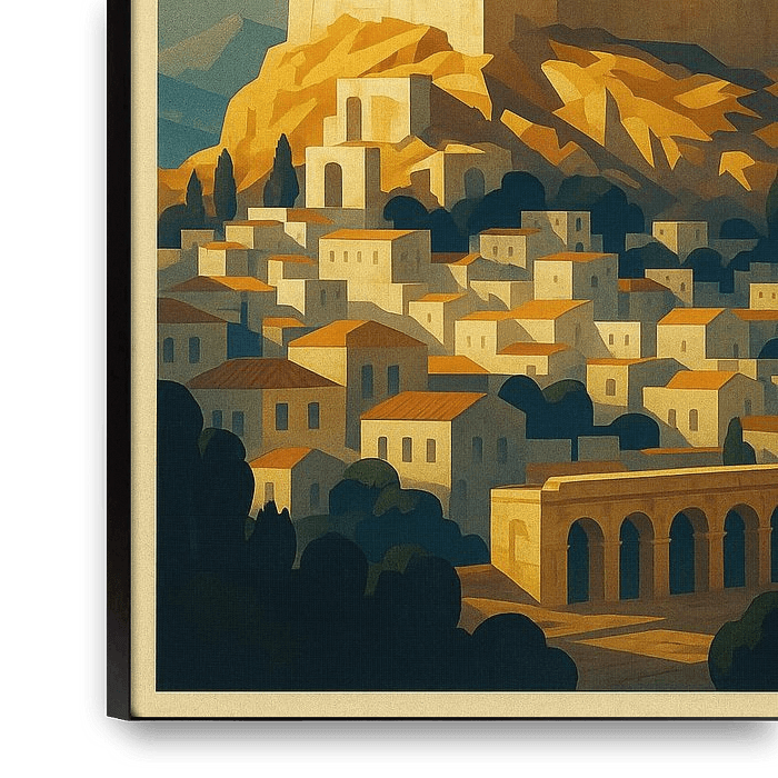This artwork celebrates the cultural grandeur of Athens, Greece, with the Acropolis rising above the city in radiant sunlight. Designed in a vintage Art Deco style, golden beams highlight the Parthenon and ancient ruins, symbolizing the enduring legacy of one of the world’s greatest civilizations. Warm earth tones mix with deep blues…