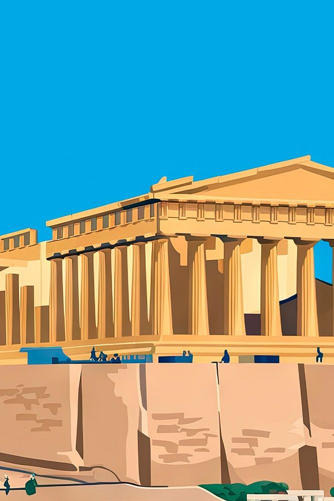 The Parthenon rises majestically over the hills of Athens in brilliant yellow and blue. The clear lines and monumental order of columns bear witness to ancient splendour and the cradle of democracy. Shadows of pine trees frame the grandiose building, while the sky hovers radiantly over the history and culture of Greece. A truly captivating spectacle!