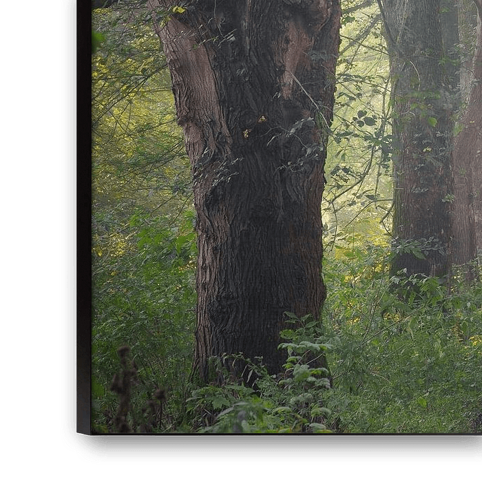 A tranquil forest scene captured at sunrise in the Broekpolder, where soft golden light filters through the trees and mist lingers gently above the path. A calming and atmospheric piece, ideal as nature-inspired wall art for any room that calls for peace, reflection and warmth.
