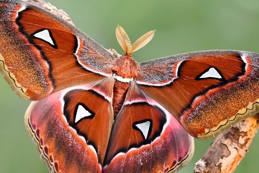 Attacus lorquinii is a moth that is very similar to the Atlas butterfly but this one is from the Philippines. It is one of the largest butterflies in the world with a wingspan of 25-30 cm. On the tip of its wings appear to be snakeheads that can scare off potential predators. Because the adults stop eating, the butterfly's lifespan is short. Females (which are a lot gropter) last up to two weeks and males often die after just one week. Just enough time for a new generation.