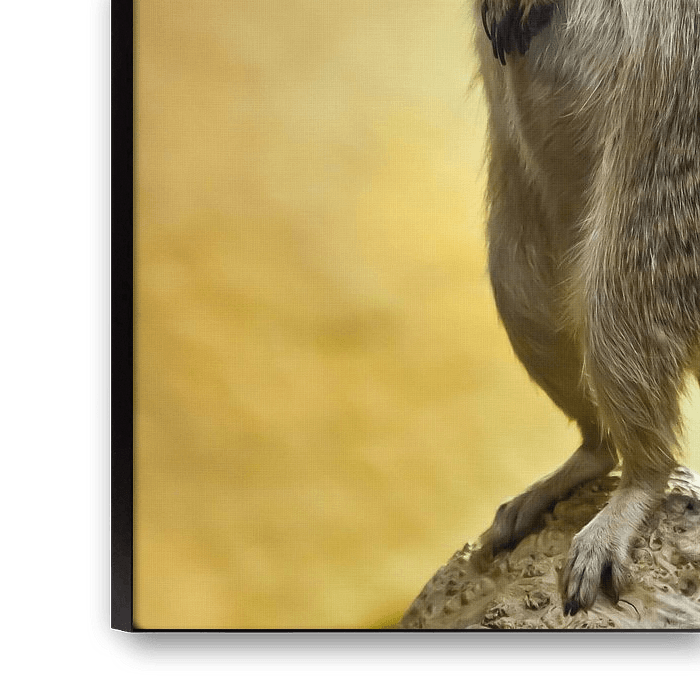 Buy the photo Attentive cute meerkat worth column. Watchful meerkat on a yellow-orange background. by Michael Semenov on canvas, ArtFrame, poster and wallpaper, printed on demand in high quality.