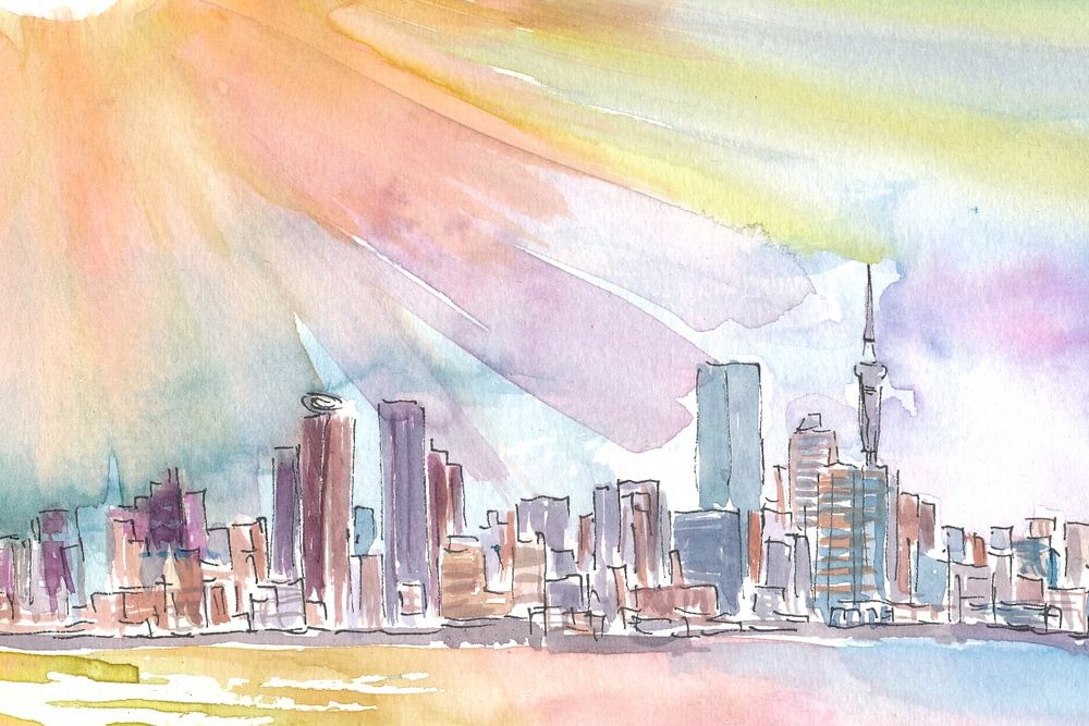 Buy this painting Auckland New Zealand Skyline Waterfront with Sunset by Markus Bleichner as a reproduction on canvas, ArtFrame, poster and wallpaper, printed on demand in high quality.