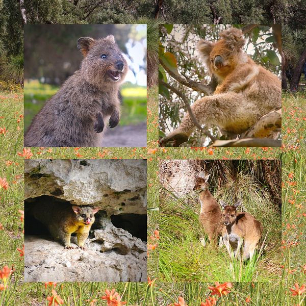 Collection of wild Australian marsupials: Quokka, Koala, common brushtail possum, Western grey kangaroo