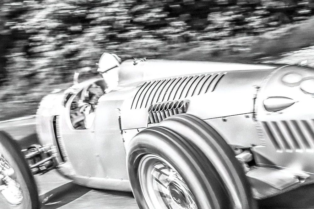 Auto Union Grand Prix Rennwagen Type C V16 driving at high speed. Panning photo in black and white.