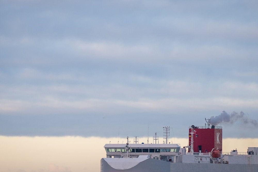 Car boat or car carrier Thames Highway of "K" Line European Sea Highway Services (KESS) and cutter UK-95 Aart Maaskant on the Westereems. The UK-95 is en route to Eemshaven and the Thames Highway to Emden, Germany.