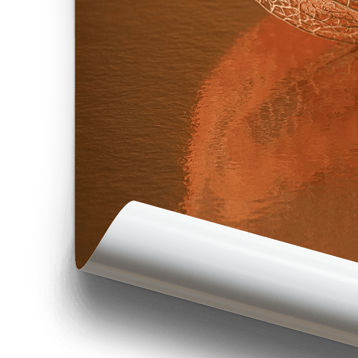 "Autumn! A lantern reflected in the warm surface" is a macro photo of a lantern of the Lantern Plant (Physalis Elkekengi). This lantern is already largely decayed, so you can see the beautiful vein structure. Some parts of the skin of the lantern are still on it, but even through this you can already see the beautiful vein structure. The lantern lies on a mirrored surface with a warm gold-orange colour. The structure in the surface creates an abstract, painterly reflection. A calm and simple still life in warm colours.
