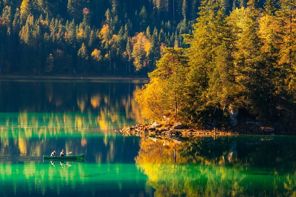 In the crisp embrace of autumn, the picturesque Eibsee comes alive with a symphony of colors that paint a vivid tapestry against the backdrop of the Bavarian Alps. This photograph encapsulates the essence of autumnal vibes reflected upon the tranquil waters of Eibsee, transforming the landscape into a mesmerizing canvas of warm hues and serene beauty.