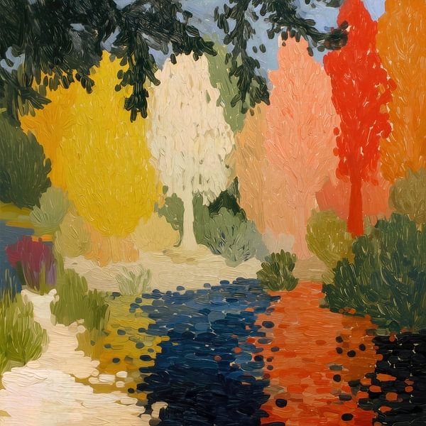An impressionistic landscape featuring vibrant autumn trees reflected in a gently flowing stream, rendered with textured brushstrokes and rich seasonal colors that evoke warmth and movement