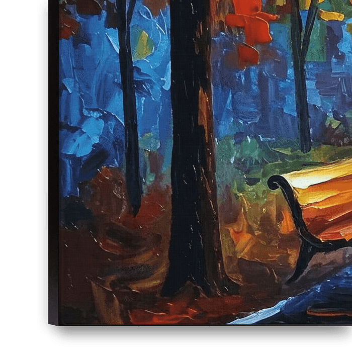 In this emotional autumn landscape, the central couple strolls leisurely down a path illuminated by the soft, golden glow of streetlights. The surrounding trees, painted with rich autumnal shades, are contrasted by the cool blues of the distant horizon. The scene conveys both the beauty of the fall season and a sense of intimacy, as the…