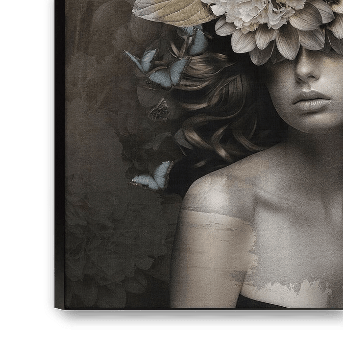 The butterflies symbolise transformation and freedom, while the floral elements create a connection to nature and the cyclical change of the seasons. The interplay between the delicate floral patterns and the vibrant butterflies lends the work a spiritual depth that emphasises its mystical character. The elegance and femininity of the depiction blend harmoniously with the magic and grace of nature.