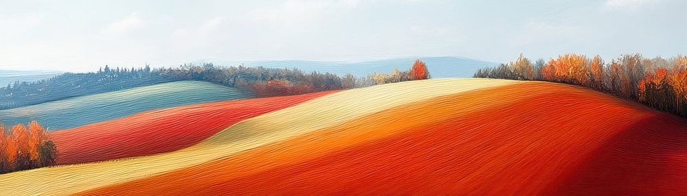 Autumn Whisper - This Moldovan landscape painting shows a serene and colourful autumn scene with rolling hills covered in a mosaic of red, orange and yellow hues, reflecting Moldova's rich and natural landscape.