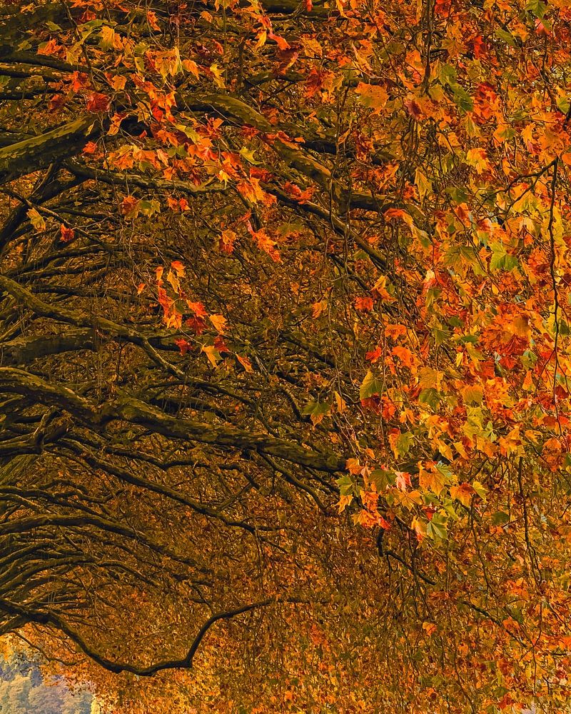 A vertical 4:5 photo of autumn and the trees hanging over the Baldeneysee show their best side.
