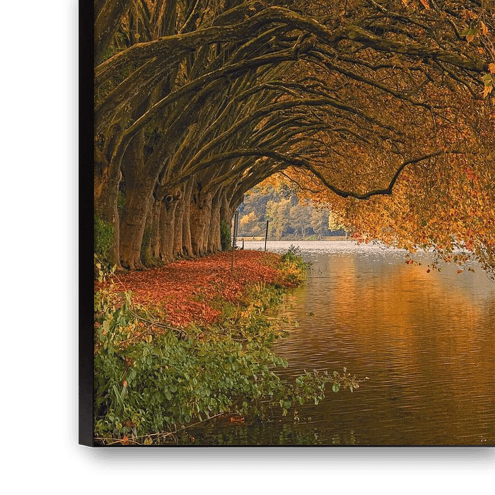 A vertical 4:5 photo of autumn and the trees hanging over the Baldeneysee show their best side.