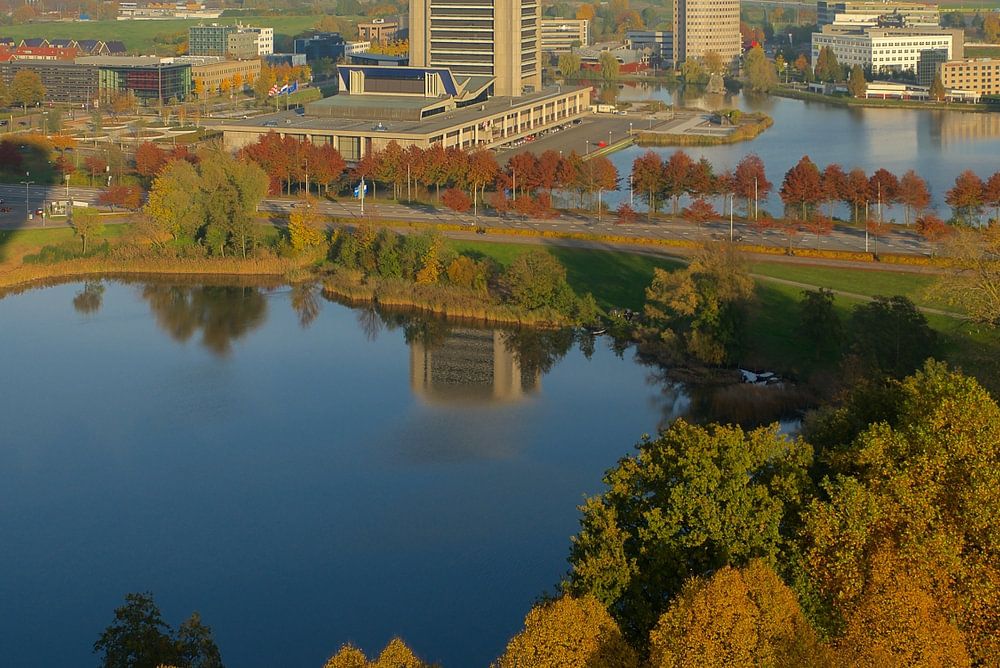 An image over the Zuiderplas and the Province House in 's-Hertogenbosch, made from a hot air balloon during a beautiful autumn evening.