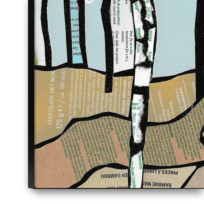 collage of pieces of packaging composed as if they were a mosaic in the abstracted representation of a forest with three birches in the foreground. Up close or at high magnification, the texts invite one to retrace the product from which the packaging comes. at some distance, or at a small size, the texts become unimportant and the…