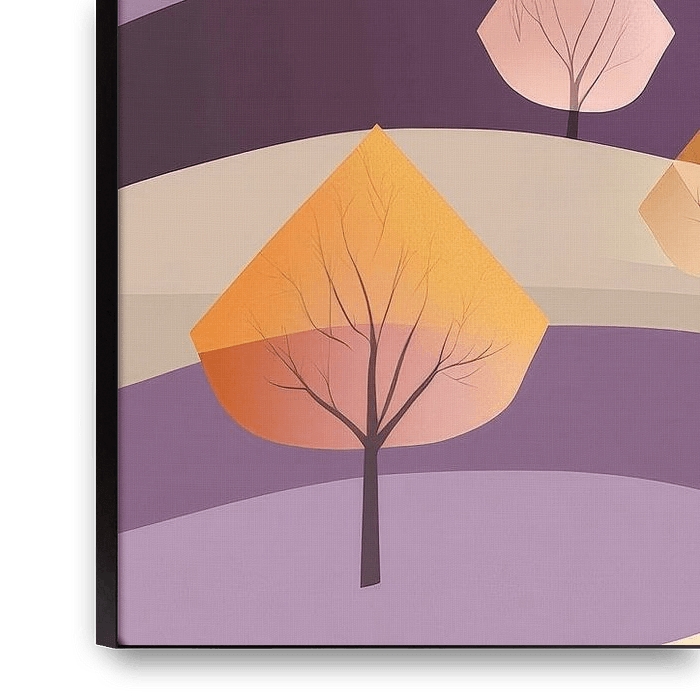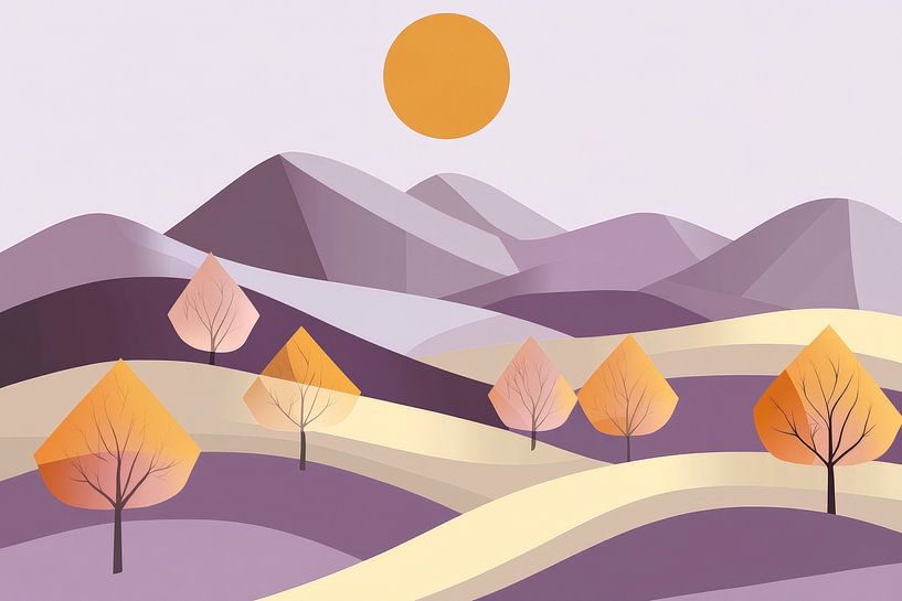 A harmonious interplay of colours in soft purple and yellow tones transports the viewer to an idyllic, autumnal landscape. The stylised mountains and minimalist trees radiate calm and serenity. Ideal for the living room, this work of art creates a relaxed atmosphere that invites you to linger and revitalises the senses.