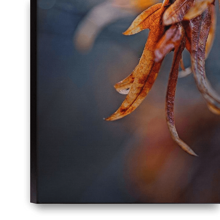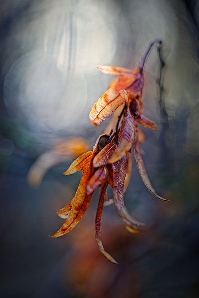 Branch with withered leaves in autumn colours captured in the backlight of the rising sun.