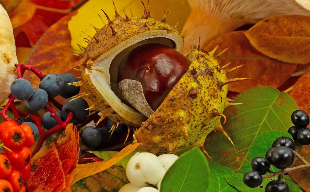 Autumn decorations made from leaves, fruit and mushrooms by Michael Schuppich