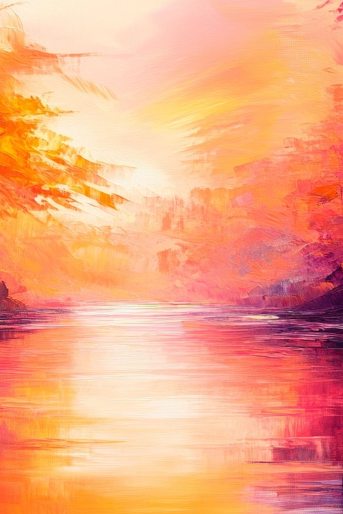 An enchanting interplay of warm orange and purple tones dances across the surface of the water, while the gentle silhouettes of the trees in the background radiate harmony. This dreamlike landscape brings peace and serenity and fits perfectly in a living room, where it accompanies atmospheric moments and conversations.