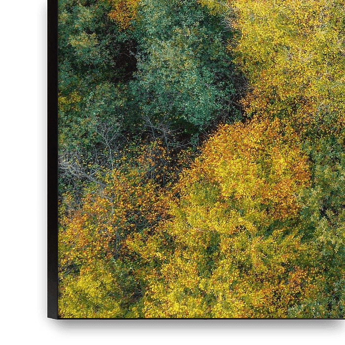 Autumn forest with colorful leaves seen from above during a beautiful fall day. The leaves on the trees are changing color in this woodland. The dense canopy of trees in the forest seem like a patchwork of colorful leaves.