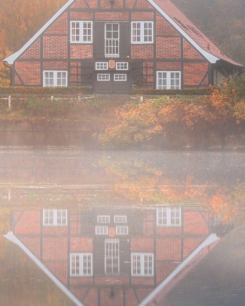 This atmospheric photograph shows a picturesque half-timbered house on the banks of the Kupferteich pond in Wohldorf, Hamburg, in autumn. The delicate mist hovering over the water creates an almost fairytale-like atmosphere. The bright colours of the autumnal leaves are harmoniously reflected in the smooth water of the pond and enhance the magical quality of the scene.