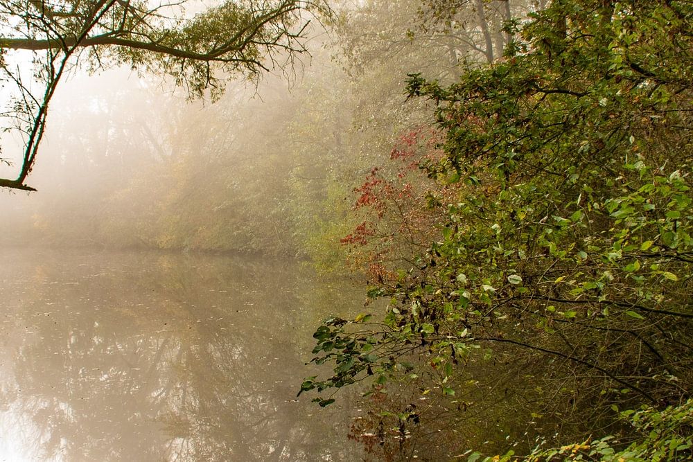 This photo was taken in a small forest area. Looking from a small bridge, you can see the leaves already taking on autumn colours. It is a calm autumn day and the sun has not been up very long, nor is it very powerful. The mist in the water looks mysterious. In the water, you can see the faint reflection of the trees a little way away.