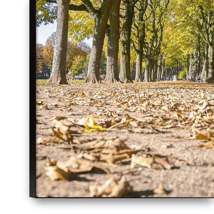 Typical autumn plate with leaves on the ground of the walkway, and beautiful green and yellow coloured leaves in the large trees in the Cinquantenaire Park in Brussels, Belgium.