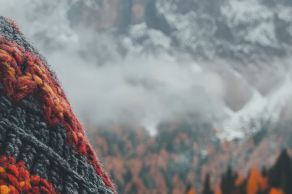 A fanned out play of colours of bright orange and soft grey tones embraces the snow-covered peaks of a majestic mountain landscape, while wafts of mist gently drift over the forests. This picture radiates a calming atmosphere, perfect for the living room, where it combines cosiness and wanderlust.