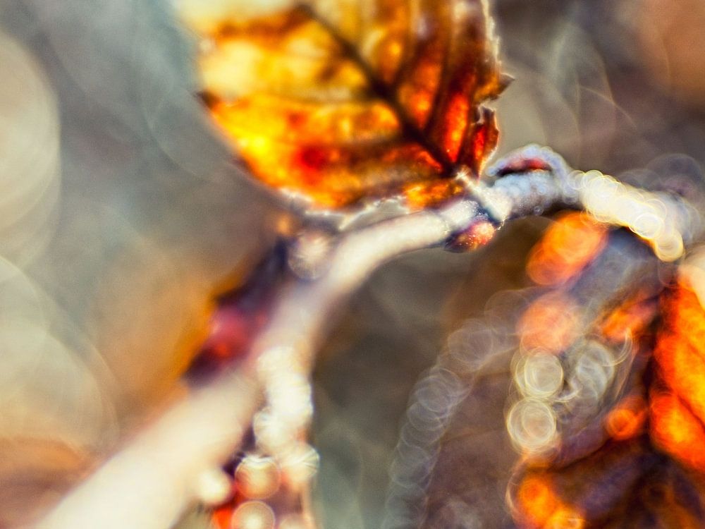 A dreamy image of a branch with brown-red leaves in autumn colours.
