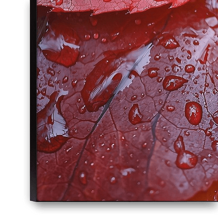 The picture shows colourful autumn leaves in shades of red, yellow and orange, covered with glistening raindrops. The vibrant colours and moist texture capture the beauty of a rainy autumn day.