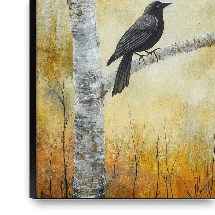 Two black birds sit on a branch, surrounded by slender birch trees with white bark. The background is in warm autumn tones, with scattered orange leaves.